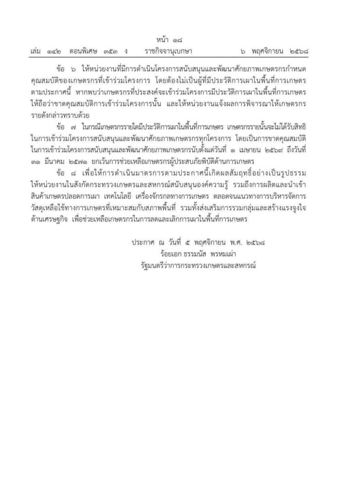 ประกาศกระทรวงเกษตรและสหกรณ์ เรื่องมาตรการ บริหารจัดการป้องกันและเเก้ไขปัญหาฝุ่นละอองขนาดเล็ก ไม่เกิน 2.5 ไมครอน PM2.5 ภาคการเกษตร (ฉ.2) 5 พฤศจิกายน 2568