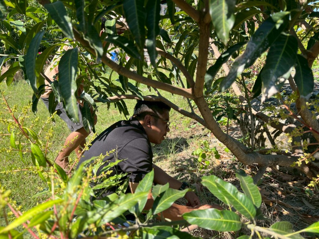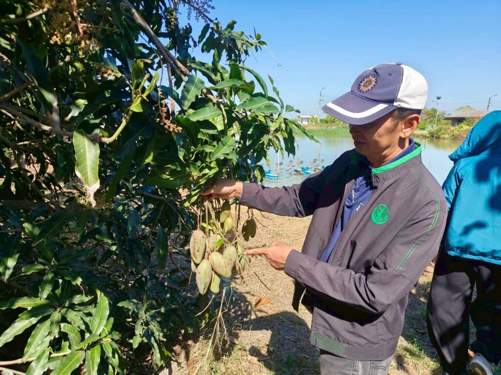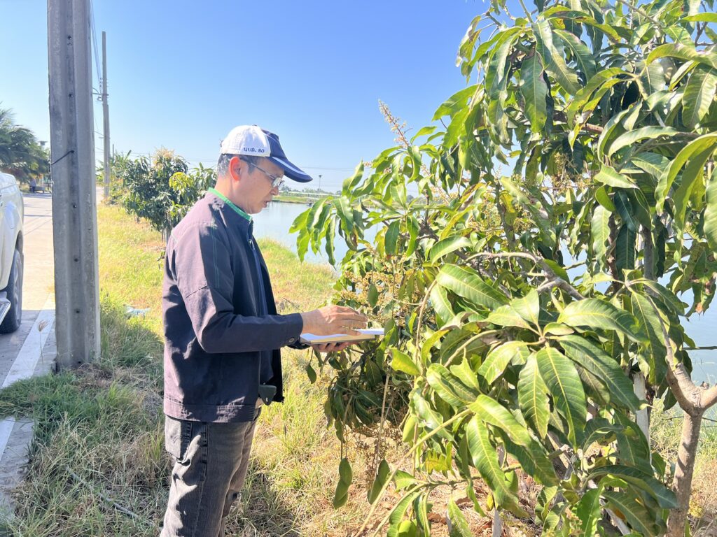 วันที่ 24 ธันวาคม 2568 กลุ่มส่งเสริมและพัฒนาการผลิต สำนักงานเกษตรจังหวัดสมุทรปราการ ร่วมกับสำนักงานเกษตรอำเภอบางบ่อ ได้ลงพื้นที่เพื่อติดตามความก้าวหน้าการขับเคลื่อนงานส่งเสริมการผลิตมะม่วงน้ำดอกไม้สมุทรปราการ ของเกษตรกรที่ได้เข้าร่วมกิจกรรมส่งเสริมการผลิตมะม่วงน้ำดอกไม้สมุทรปราการ (สร้างสวนใหม่) ประจำปีงบประมาณ พ.ศ. 2566 จากการลงพื้นที่ติดตามพบว่าต้นมะม่วงส่วนใหญ่อยู่ในช่วงระยะกำลังออกช่อและติดผล ทั้งนี้ได้พบการเข้าทำลายของเพลี้ยไฟเป็นจำนวนมาก จึงได้แนะนำการดูแลรักษาเบื้องต้น โดยให้เร่งกำจัดเพลี้ยไฟในช่อดอกมะม่วงโดยด่วน ดำเนินการการตัดแต่งมีช่อดอกมะม่วงให้มีปริมาณที่เหมาะสม กรณีช่อดอกติดผลแล้วให้คัดเลือกผลที่สมบูรณ์ไว้เพียงช่อละ 1-2 ผล เพื่อให้เหมาะสมกับขนาดของลำต้น และควรมีการกำจัดวัชพืชรวมถึงหมั่นดูแลให้น้ำและให้ปุ๋ยอย่างสม่ำเสมอจนถึงระยะเก็บเกี่ยวผลผลิตต่อไป ณ หมู่ที่ 11 ตำบลบางบ่อ อำเภอบางบ่อ จังหวัดสมุทรปราการ