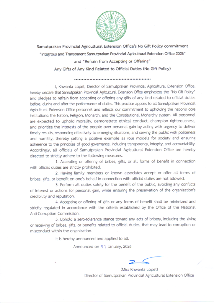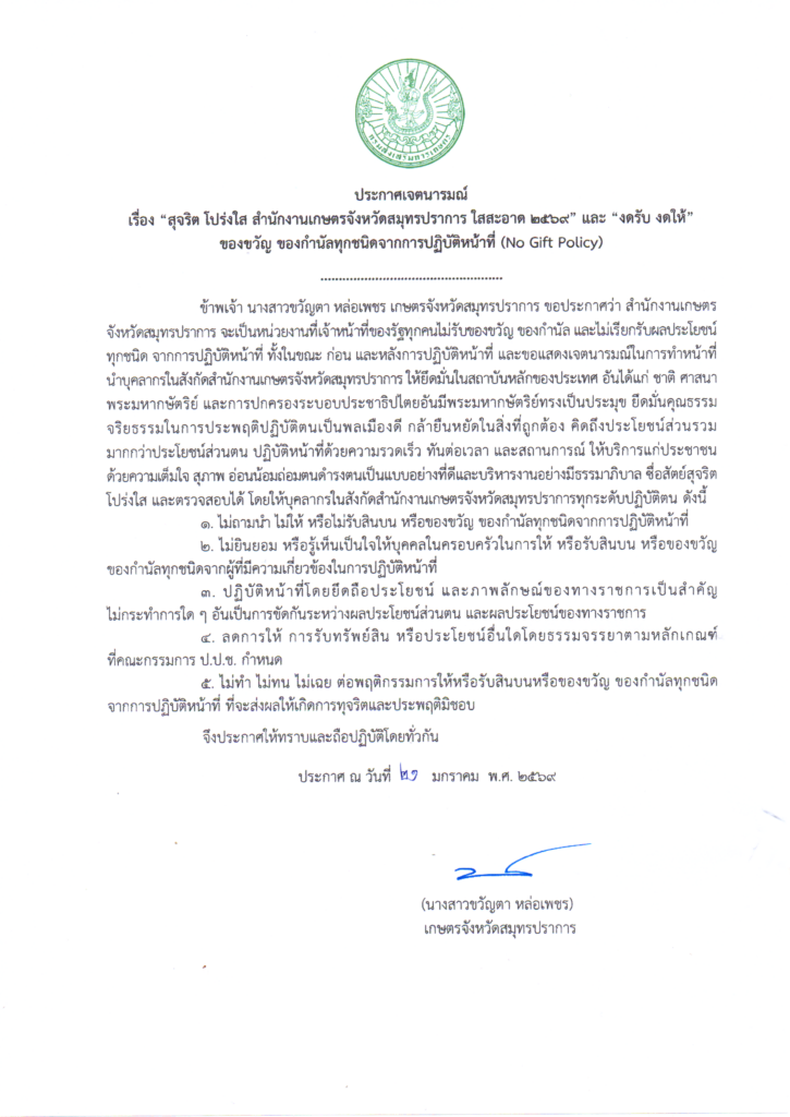 เกษตรจังหวัดสมุทรปราการ ขอประกาศเจตนารมณ์ เรื่อง “สุจริต โปร่งใส งดรับ งดให้ของขวัญ ของกำนัลทุกชนิดจากการปฏิบัติหน้าที่ (No Gift Policy)”